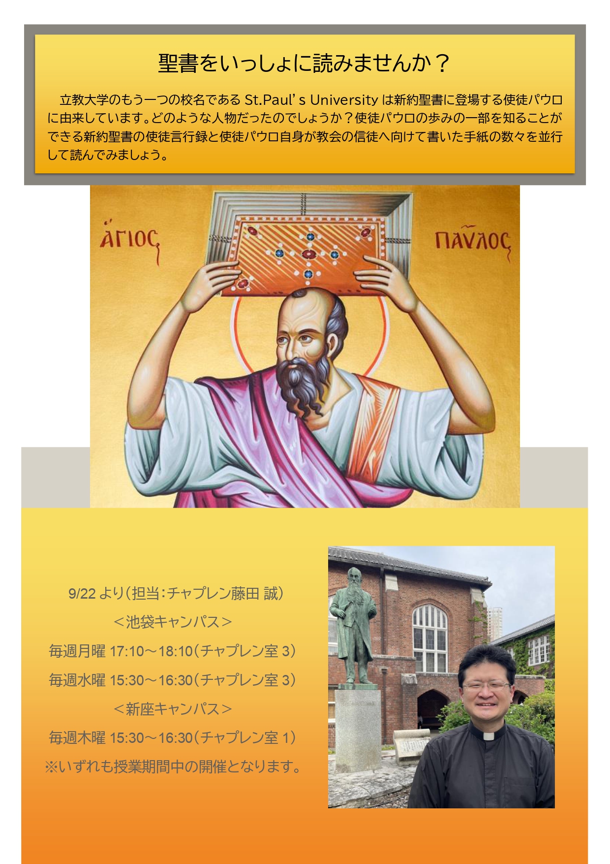 日頃の学生生活の中でふと疑問に感じたことや考えたことをチャプレンに聞いたり尋ねたりすることのできる「チャプレンアワー」や「キリスト教入門」「聖書に学ぶ会」など、各チャプレンが主催する企画・集いが行われています。おひとりでも、またお友達と一緒でも、また途中からの参加や一回だけの参加も歓迎します。気が向いた時だけでの参加でもかまいません。お気軽にチャペル会館にあるチャプレン室をお訪ねください。詳細は以下をご覧ください。