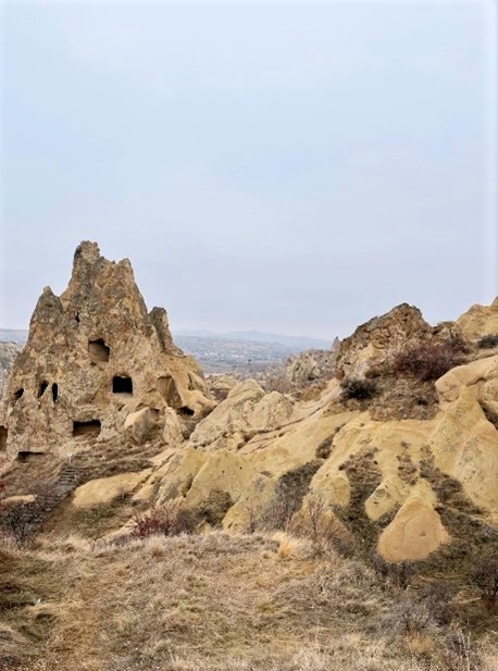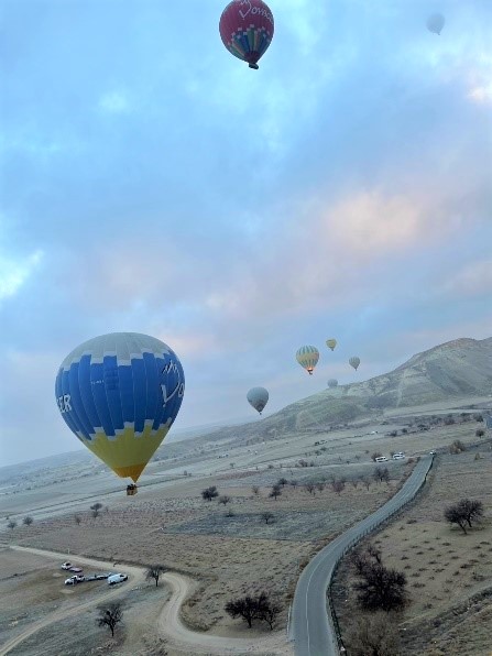 年末年始はトルコ中央部にあるカッパドキアで過ごしました。カッパドキアは、イスタンブールから飛行機で約1時間半の距離にあり、火山活動と風雨の浸食によって生まれた奇岩群や岩柱が点在し、熱気球や洞窟ホテルでの滞在が楽しめる観光地として知られています。朝日に照らされた空を浮かぶ熱気球の中から見渡す壮大な景色は、言葉を失うほど美しく、まるで夢の世界にいるかのような感覚でした。 また、カッパドキアには古代ヒッタイトやローマ帝国時代のキリスト教徒が暮らし、岩をくり抜いた住居や地下都市を築きました。ギョレメの岩窟教会では、美しいフレスコ画が今も残り、当時の信仰と文化を感じることができます。 トルコでは新年を盛大に祝う習慣はあまりなく、観光地も比較的静かで、落ち着いた時間を過ごすことができました。