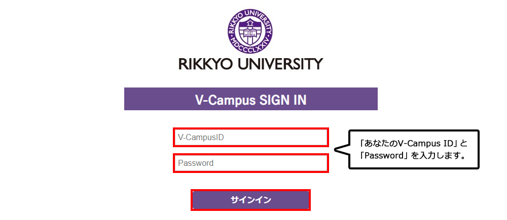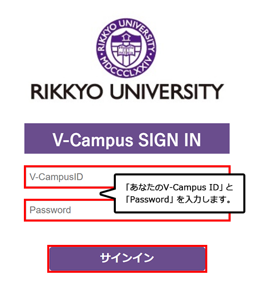 立教大学のV-Campusサインイン画面で、「あなたのV-Campus ID」と「Password」を入力し、「サインイン」をクリックします。