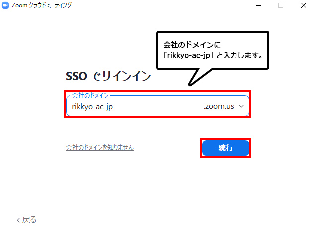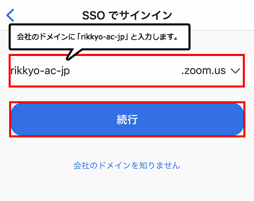 「会社のドメイン」に「rikkyo-ac-jp」と入力し、「続行」をクリックします。