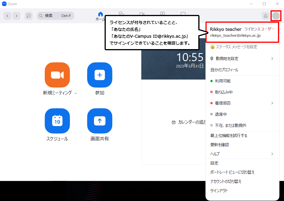 プロフィールアイコンをクリックし、ライセンスが付与されていることと、「あなたの氏名」「あなたのV-Campus [email protected]」でサインインできていることを確認します。ライセンスが付与されていない状態の場合は「ベーシック」と表示されます。